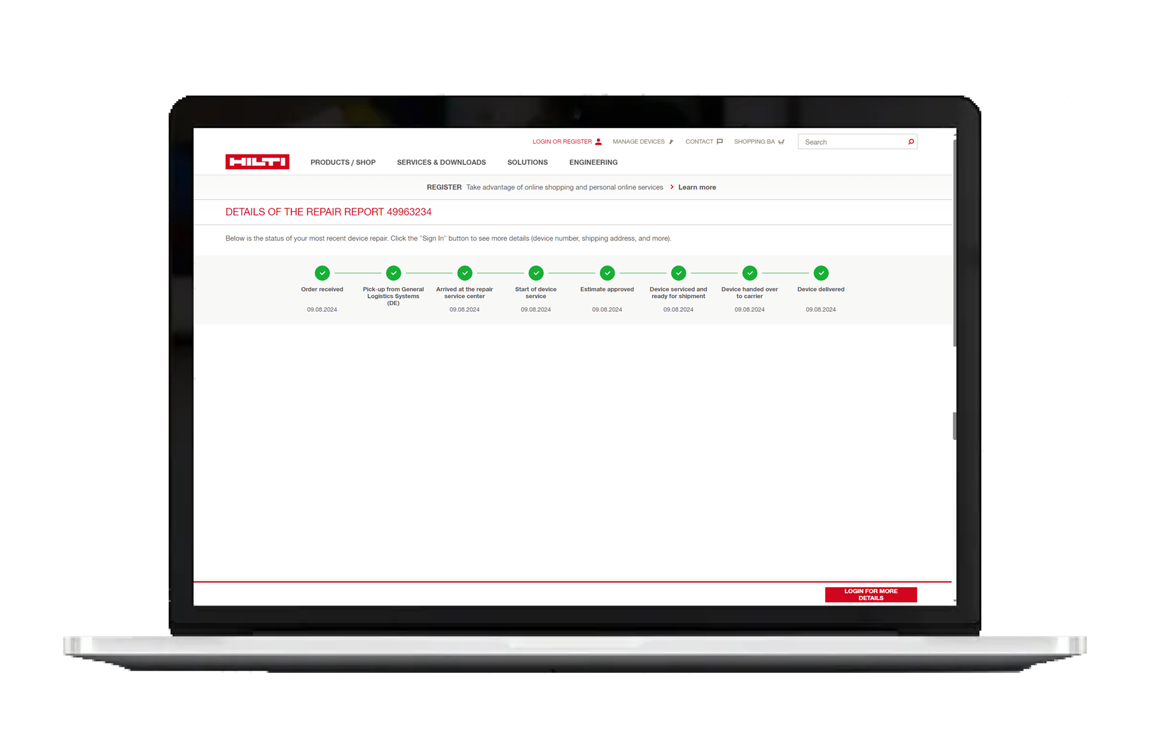 Tranparent Repair Experience provides customers with real time updates on the repair of their tool for each step of the journey.